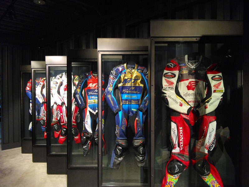 入るとすぐ、歴代のクシタニレザースーツがお出迎え!!