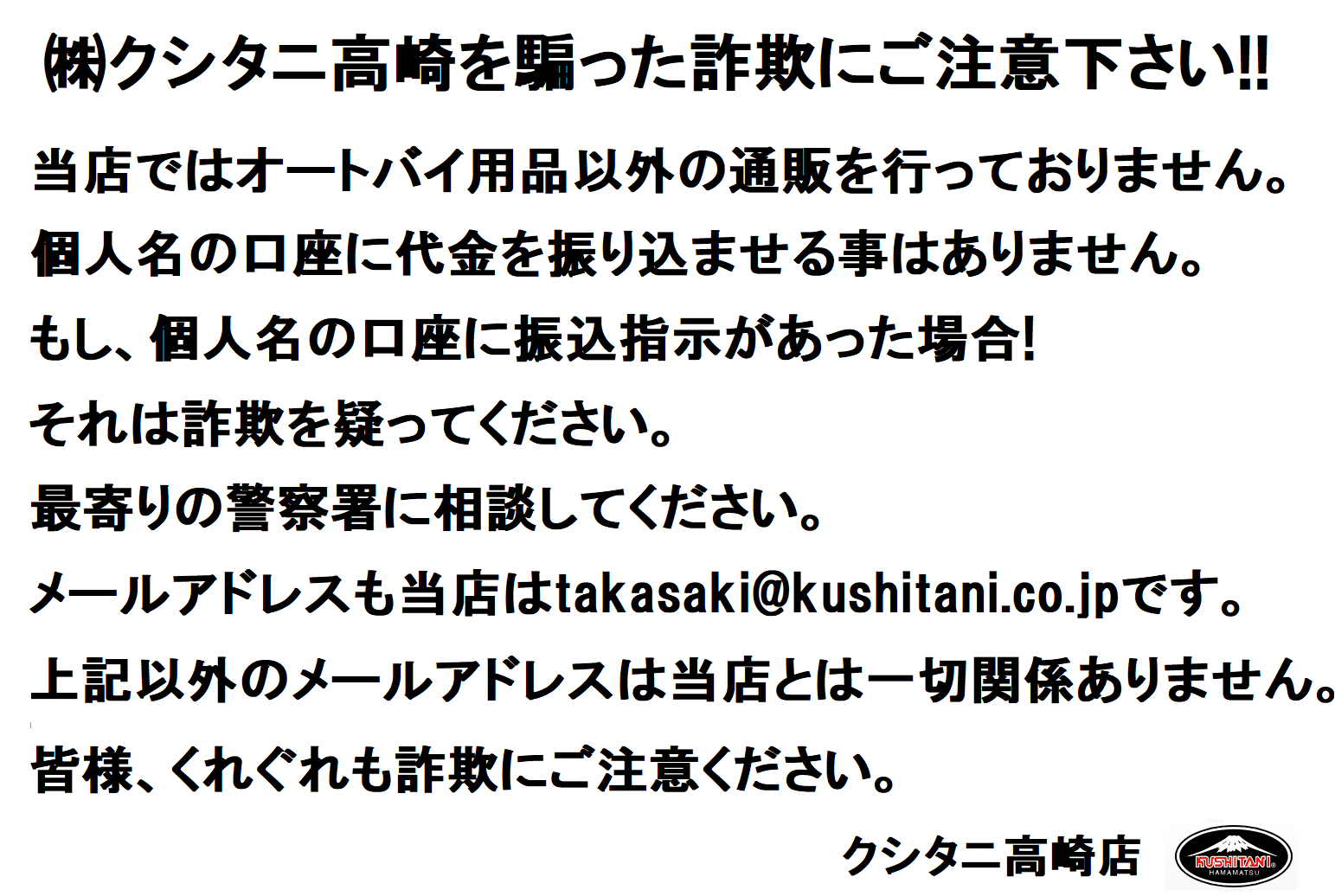 この度、弊社の会社情報を無断で使用して詐欺行為をはたらく悪質なサイトが複数存在していることを確認いたしました。弊社とは全く無関係のショッピングサイトになりますので、お客様におかれましては、くれぐれも悪質なサイトをご利用なさらぬよう十分ご注意下さい。 それらの悪質サイトでは潟Nシタニ高崎の名前を勝手に使用し当店ではサイトの商品を扱っているわけではありませんが、「よくあるご質問」のQ&Aが、潟Nシタニ高崎オンラインショップのQ&Aをそのまま無断転載されており、問い合わせ先として潟Nシタニ高崎店の電話番号とメールアドレスが掲載されています。 このため、当該サイトで商品を注文したお客様より「振込をしたのに商品が届かない」という問い合わせが弊社宛に来ている状況です。 現在判明している悪質サイトの特徴は以下の通りです。 ・正規販売サイトよりかなり低価格で販売している ・商品画像は他サイトの画像やメルカリの出展品の画像などを流用している ・決済方法が銀行振込(前払い)しか選べない ・振込先の口座名義が個人名 ・振込後、商品が出荷されず連絡も取れなくなる 万が一被害に遭われた場合、最寄り警察署のサイバー犯罪相談窓口、もしくは消費者生活センターへご相談いただきますようお願いいたします。また、口座振込やクレジットカード払いをした場合には、振込先の金融機関やクレジットカード会社に被害のご連絡をお願いいたしします。 ※詐欺サイトとお客様の間でのトラブルに関しまして、当社は一切の責任を負いかねます。十分にご注意くださいますようお願い申し上げます。 当店も、警察署に被害届提出済、商工会、税理士、弁護士に依頼済です。 【都道府県警察本部のサイバー犯罪相談窓口等一覧】 https://www.npa.go.jp/bureau/cyber/ichiran.html 【消費生活センター】 https://www.kokusen.go.jp/map/ 該当のサイトがございましたら、以下より通報をお願い申し上げます。 【一般社団法人セーファーインターネット協会 悪質ECサイトホットライン 通報フォーム】 https://www.saferinternet.or.jp/akushitsu_ec_form/ | |||