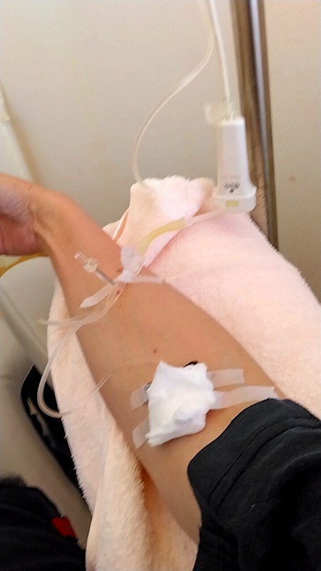 朝一、かかりつけ医に行きました、発熱外来でしたので、車で待機、健診してもらって、そく点滴でした。