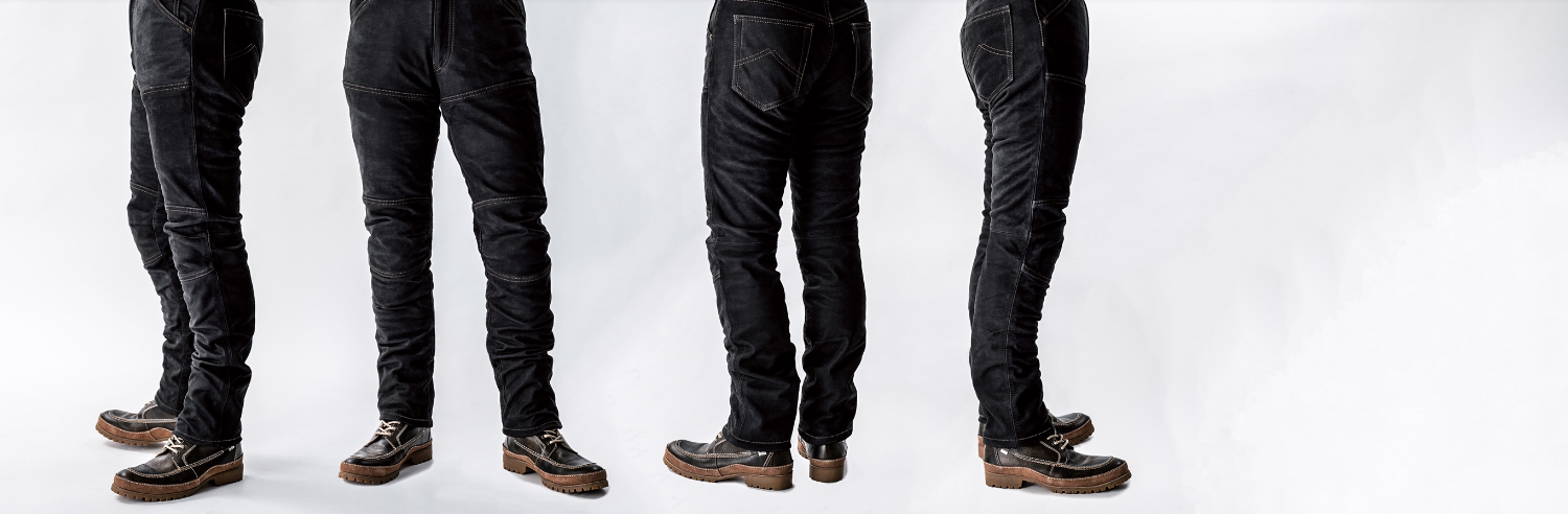 ライダーススタイルのエクスプローラージーンズ。裾に向かって細めにしたスタイリッシュなテーパードシルエット。乗車時のバタつきも抑え、すっきりと。 ●素材:〈表〉ステア牛革(フッ素加工)〈裏〉ポリエステル100%(メッシュ) ●仕様:〈膝〉ソフトパッド標準装備(脱着式) ●カラー:オールドブラック ●サイズ:28〜36inc