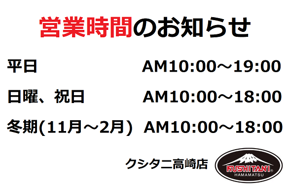 株式会社 クシタニ高崎 〒370-0069 群馬県高崎市飯塚町1190-4-7 [OPEN] 10:00〜19:00 土日祝 10:00〜18:00 冬期11月〜2月:10:00〜18:00 [CLOSED] 毎週火曜日/水曜日 [Tel] 027-363-8192 [Fax] 027-363-8193