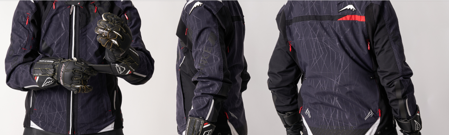 スポーツバイクのライディングに最適なジャケット。スプレット柄エンボスを施した素材を採用し表情をもたせています。ライディングフォームに合わせたパターンに強度の高い素材で安全性を確保しています。高速走行時にもバタつきを最小限に抑える機能を袖や身頃に装備しています。防水生地によりツーリングでも使いやすく、胸のエアーインテークと背脇のエアーダクトで幅広いシチュエーションに対応できるモデル。