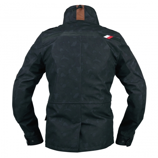 防水生地を採用することでアーバンユースからツーリングにまで使用できるジャケット。革素材をアクセントに加えたリップストップ素材にカモフラ柄を組み合わせ質感のある仕上がりに。高機能ウェアをバイクのみならず普段使いしてもらいたいというコンセプトですが、もちろんライディングに適した機能は全て持ち合わせています。裏地は吸汗速乾素材。