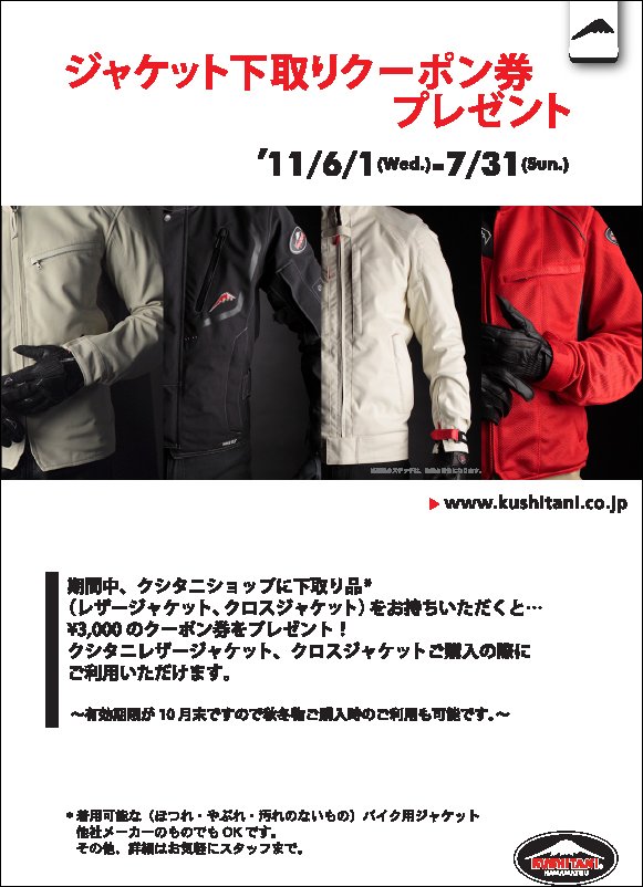 期間中、KUSHITANI PRO SHOPに下取り品をお持ちいただくと\3,000のクーポン券を発行いたします。 KUSHITANIのレザージャケット、クロスジャケットをご購入の際にご利用いただけます。