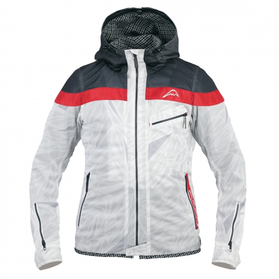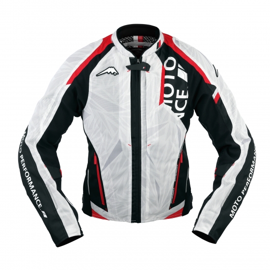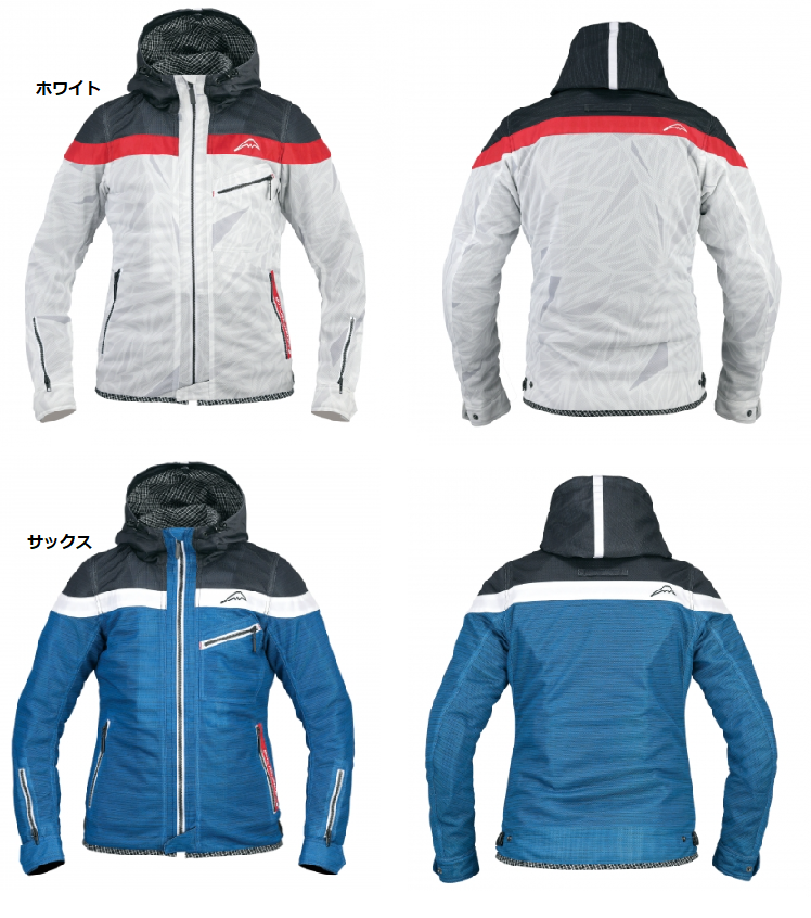 フード付きのフルメッシュジャケット。メッシュ生地にプリントを施しています。ホワイトはエッジ柄プリント、他3色は同系色のスラブ調プリント。走行中は、フードをタブに留めてご使用ください。