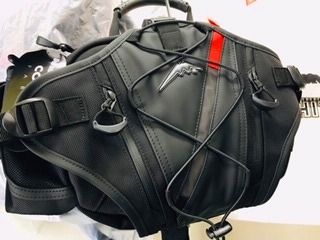 ●素材:1680dコーデュラ®ナイロン(PVC コーティング)、ナイロン(PVC コーティング)、ポリエステルメッシュ、人工皮革 ●カラー:ブラック ●サイズ:H215×W270×D90mm(約5.2L) ●グローブレスト用ラバーコード、スマホポケット、ペットボトルホルダー、コインホルダー(K-3594/¥900+税)装着可能、レインカバー、ショルダーストラップ
