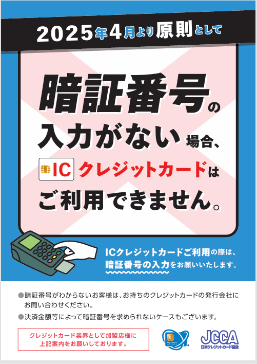 そして、本日04月01日(火)より、カード決済は「サイン」は使えません。必ず「暗証番号入力」をお願いいたします。