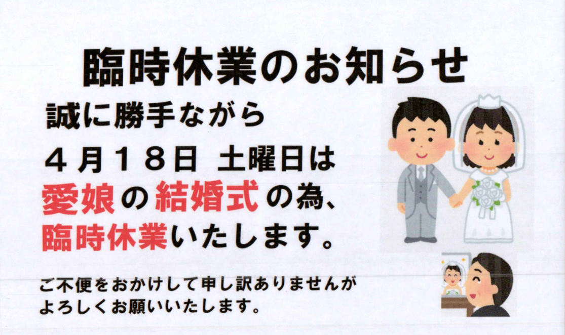 本日04月18日(土)、私事ですが愛娘の結婚式の為、クシタニ高崎店を臨時休業とさせていただきます。